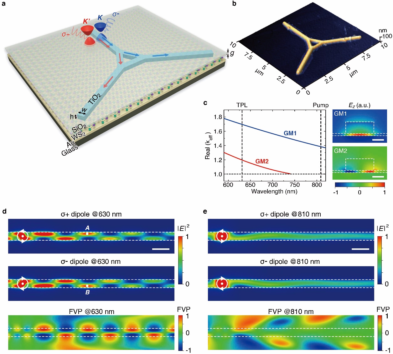 在这项工作中,我们创新性地设计并制备了Au-WS2-SiO2-TiO2混合波导(图1a和b),该波导在WS2激子的谐振波长(630 nm)上同时支持两个传输模(Propagation mode),这两个传输模都局域分布在SiO2间隙层中被称为间隙模式(Gap mode),且分别具有对称和反对称的电场分布(图2c)。当同样位于间隙层中的WS2单层受激辐射时,其能谷自由度(K或K’)作为一种赝自旋(pseudospin)可以等效为具有相反旋性的圆极化电偶极子,并可同时激发这两种间隙模式。由于这两种间隙模式具有不同的有效波矢neff,它们在传输中会叠加产生拍频波(beating wave),而拍频周期为l= 2π/ (kGM1–kGM2) = 1261 nm。对应于K和K’能谷的相反赝自旋,其产生的拍频波具有镜像对称的模式分布(图1d),因而激子的能谷信息被确定性地编码保存在拍频波光子的手性分布中,并低损耗地向前传输,其能谷保真度(FVP)经计算可以达到98%以上。作为对照,如果圆极化电偶极子的波长设定为泵浦激光的波长810 nm,此时该混合波导只支持一个间隙模式,因而不会产生拍频波(图1e)。