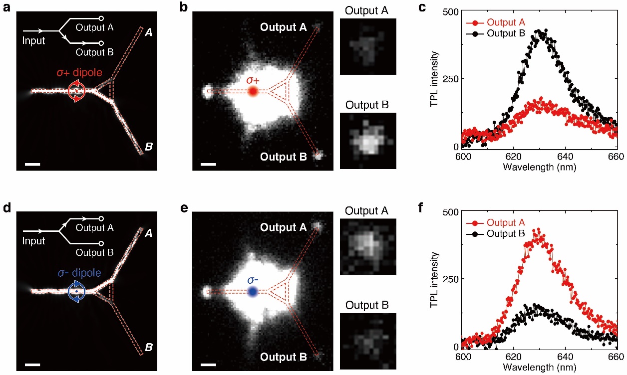 这种携带能谷信息的手性拍频模式为能谷信息的后处理奠定了基础。我们构建了一种单入双出的谷光子路由器,实现了能谷信息的定向选择性分发。通过调制入射泵浦光的圆偏振,我们可以在输入端选择性地激发K或K’谷激子。当K’谷激子被激发时,产生的谷光子会定向分发到输出端B;相反地,当K谷激子被激发时,产生的谷光子则会定向分发到输出端A(图2)。通过仿真计算,这种能谷路径选择比可以达到0.92,而实际测量值也达到了0.46。经过分析,理论值与测量值之间的偏差主要由入射泵浦光斑的尺寸造成,而WS2中声子辅助的谷间散射造成的能谷退激化效应的影响则比较微弱,这是由于混合波导在间隙中形成的纳腔具有很小的模式面积和很大的Purcell因子,因而谷激子在退极化过程发生前,即通过近场非辐射能量转移过程耦合激发了间隙模式。