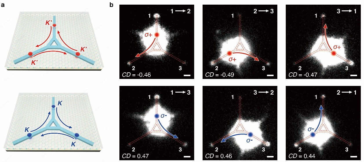 近日,由中国科大陈杨研究员、吴东教授、褚家如教授课题组,华中科大王凯教授、陆培祥教授课题组与新加坡国立大学仇成伟教授课题组组成的联合团队在谷电子学与微纳光子学交叉领域取得重要进展,首次实现了基于混合纳米波导的WS2谷光子的长距离保真传输与定向分发。研究成果以“Chirality-dependent, unidirectional routing of WS2 valley photons in a nanocircuit”为题于2022年10月3日发表在Nature Nanotechnology上。