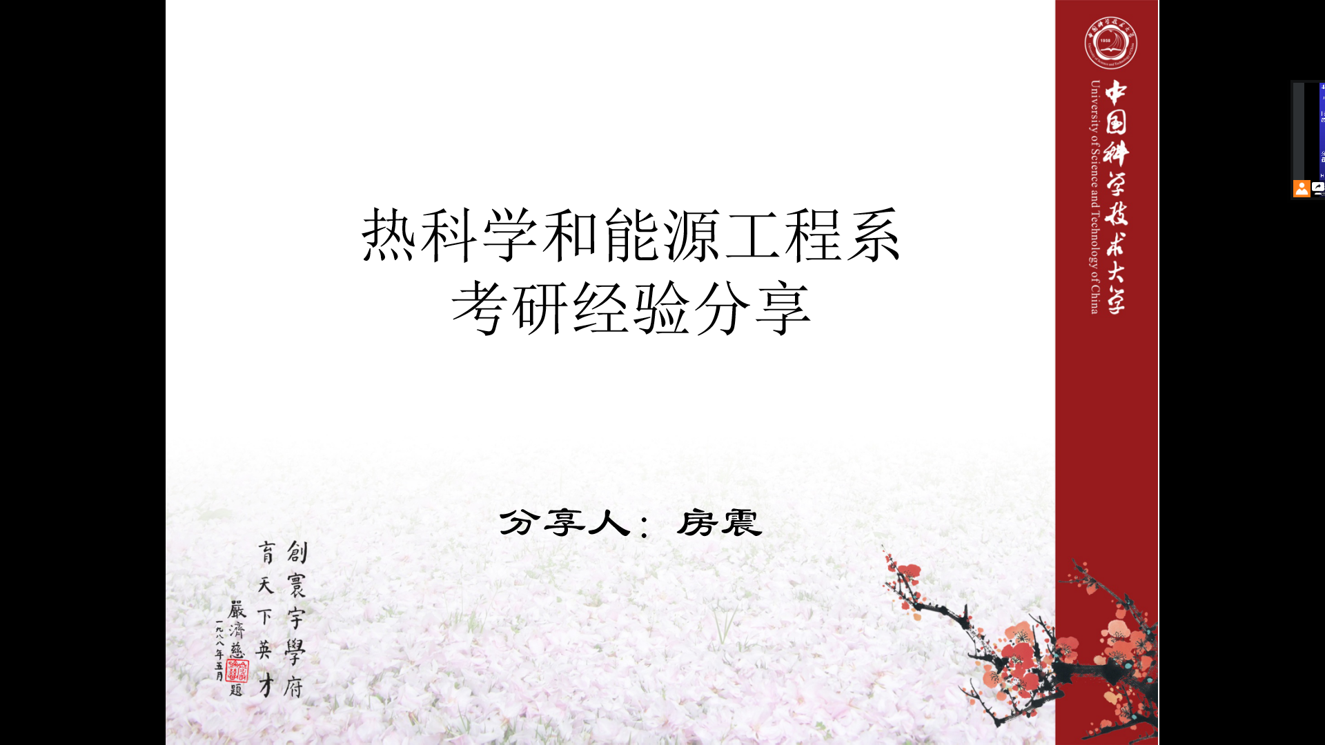 最后介绍的是热科学和能源工程系的房震同学。通过分析往年专业课试题,他尤其强调大家要牢固掌握基本概念,并根据出题人风格进行有效复习,在考研心态上鼓励大家保持轻松的应考心态。