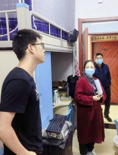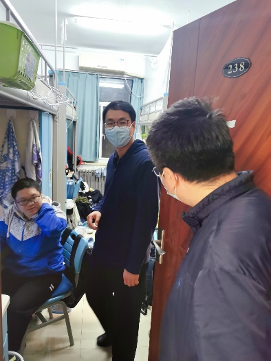 封闭不封爱,温暖一直在。11月4日晚,学院党委副书记赵凯、牟玲,热科学和能源工程系党总支书记胡芃,本科毕业班班主任年永乐老师一行前往西区1号楼、2号楼看望学院本科生,了解生活学习情况,对一宿舍同学反映的门锁损坏的情况及时进行了登记和报修,并跟踪落实。