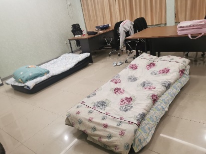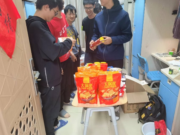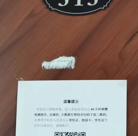 封闭留守期间,学工负责人、班主任为了让同学们坚持核酸检测,以班群接龙、在线打卡、定时闹钟等方式每天进行提醒、督促。西区蚊虫较多,老师们晚上休息不好,便一起聊聊“打蚊趣事”;气垫床瘪了,便立刻有人取泵来帮助打气;办公室、实验室、会议室等工作场所成了临时住宿的地点;学生宿舍门上的温馨提示诙谐有趣……大家互相鼓励,积极乐观。