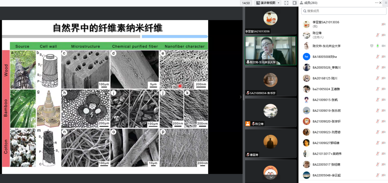 陈文帅教授给与会师生带来了一场精彩的必威最新 。纤维素是自然界中储量最丰富的一种生物质材料,因其来源丰富、可持续开发、独特的结构和性能等优势,受到人们的广泛关注。陈教授围绕着纤维素材料的研究背景、制备方法、应用前沿进行展开,生动有趣地介绍了他们课题组在林木纤丝的解聚、重组和高附加值利用等方面的最新研究进展。讲座结束后,在场师生对陈教授的讲座内容展开了热烈的讨论,陈教授还对相关问题进行了详细、耐心的解答,整个讲座过程学术氛围非常浓厚,师生们都受益匪浅。