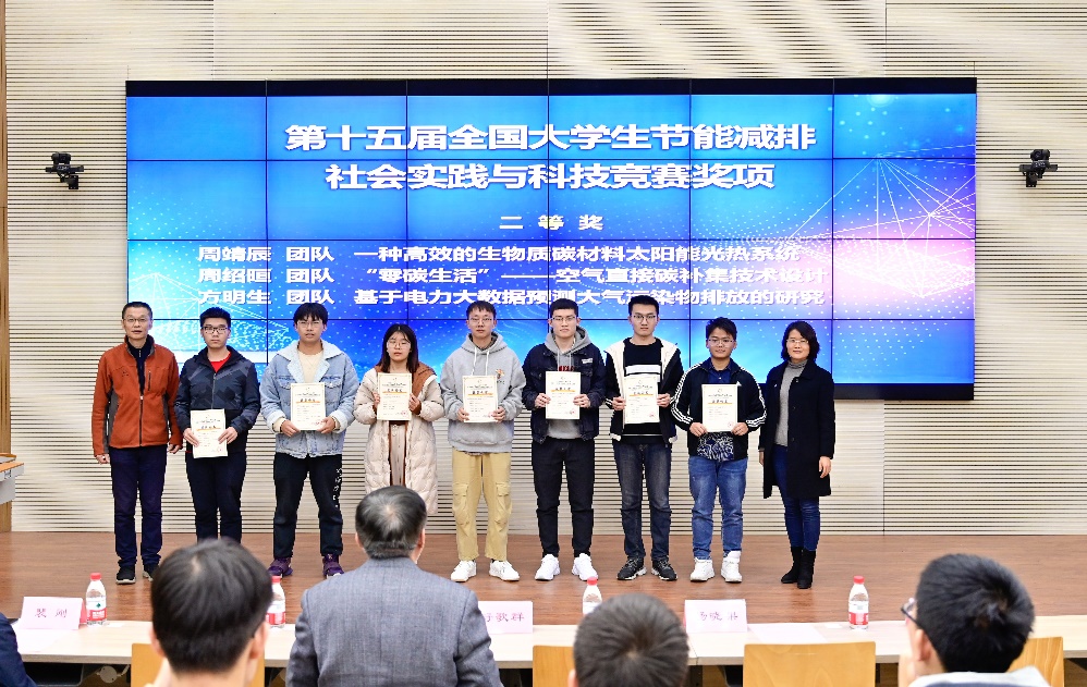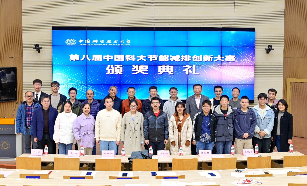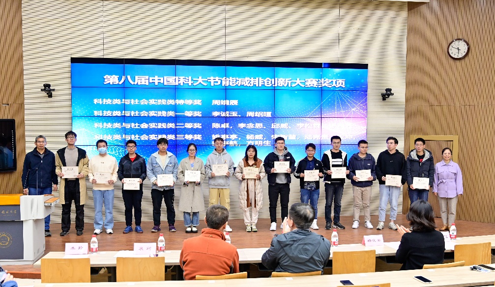 11月23日下午,第八届中国科大节能减排创新大赛暨第十五届全国大学生节能减排社会实践与科技竞赛颁奖典礼隆重举行。校党委书记舒歌群出席典礼并为获奖团队颁奖,校团委书记杨晓果,工程科学学院党委书记兼副院长刘明侯、副院长裴刚、党委副书记牟玲、热科学和能源工程系党总支书记胡芃,基本建设处、科技传播系、环境科学与工程系有关老师和获奖团队代表参加了颁奖典礼。