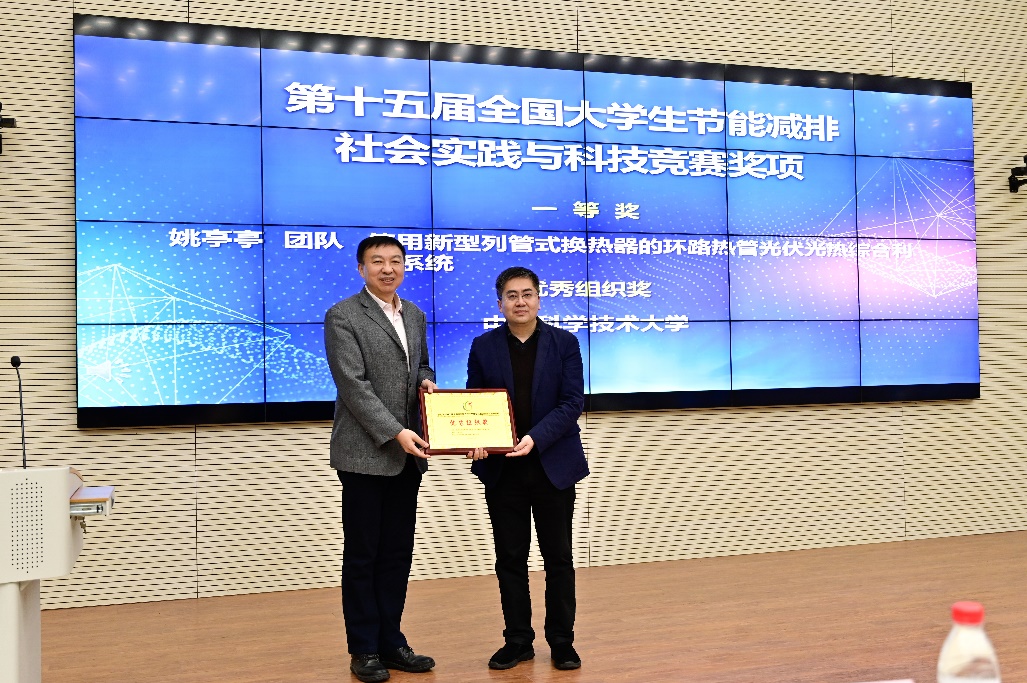 舒歌群还为大赛组委会颁发了优秀组织奖,热科学和能源工程系党总支书记胡芃作为第八届中国科大节能减排创新大赛组委会代表上台领奖。