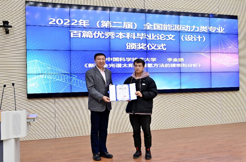 颁奖环节,舒歌群为在第十五届全国大学生节能减排社会实践与科技竞赛中获得一等奖的姚亭亭团队以及2022年(第二届)全国能源动力类专业百篇优秀本科毕业论文(设计)获得者李金鹏进行颁奖,刘明侯、杨晓果依次为获得二、三等奖的周靖辰团队、周绍晅团队、方明生团队、李诚玉团队、陈卓团队、李念思团队、汤雅云团队、宋智莹团队颁奖,裴刚、牟玲为获得校赛科技类与社会实践类奖项的团队代表颁奖。
