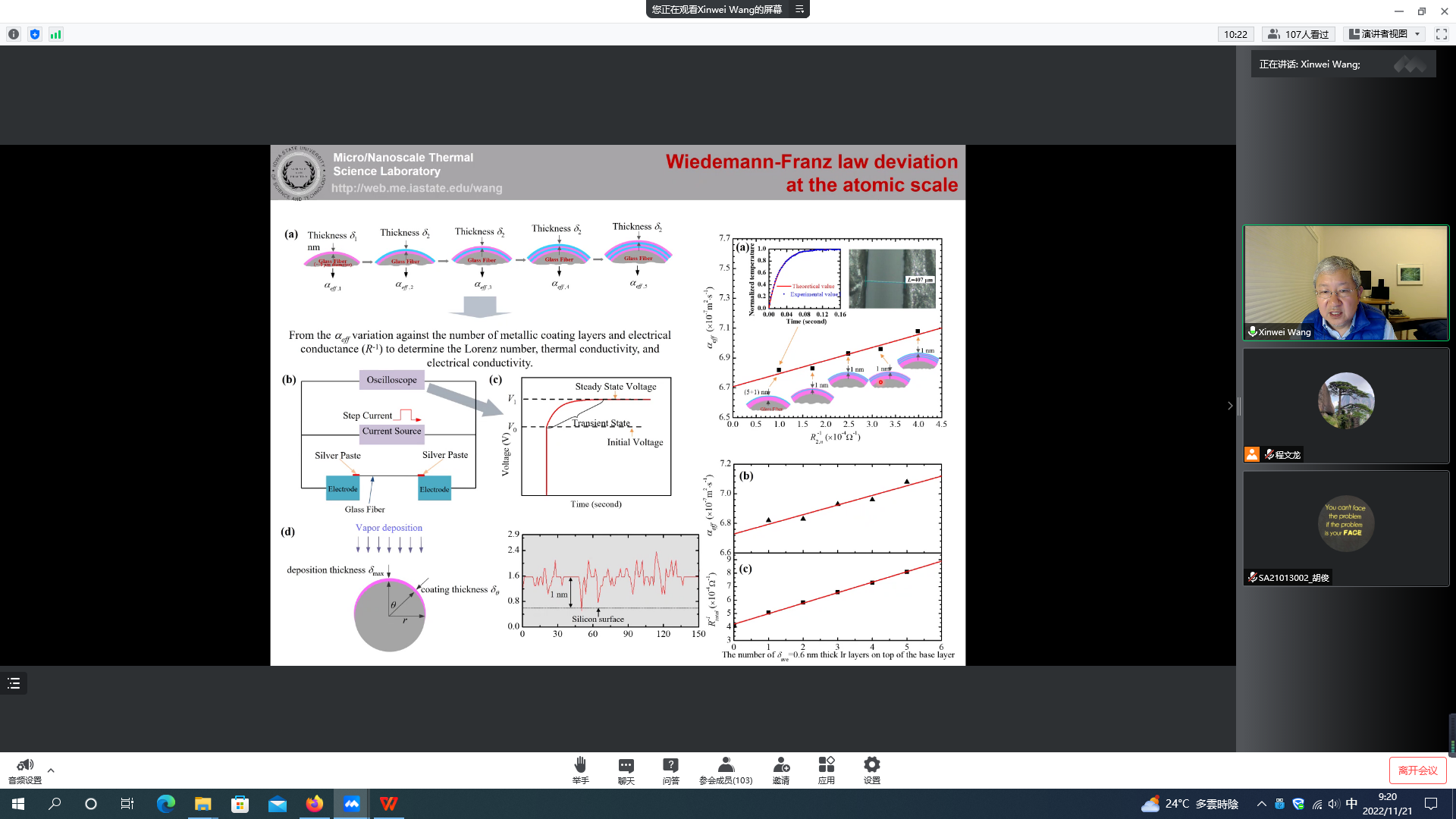 王信伟教授给与会师生带来了非常精彩的系列必威最新 。本系列报告主要围绕基于瞬态电热(TET)思想表征一维结构、二维材料以及范德华晶体中的能量传输进行展开。新兴的纳米材料和热设计在电子和能源收集领域的应用,在极其有限领域的能量传输引起了极大的关注。在首场报告中,王信伟教授首先对材料的导热系数与导电系数的测量方式做了简单介绍,重点阐述了瞬态电热测量法的优势,并列举大量实例说明温度升高与单点接触热阻的关系。王信伟教授指出常规材料、纳米级材料、极性材料及碳材料之间洛伦兹常数的差别,而导致这种现象的原因是不同材料的导电能力与导热能力会随着材料的形态或缺陷等呈现不同程度的增减,当导电能力减弱的程度大于导热能力的程度,洛伦兹数将上升,反之则会下降。