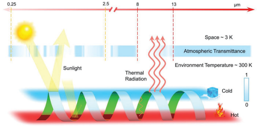 在该项工作中,研究人员基于螺旋结构发展了一种辐射冷却和选择性光热吸收协同利用的策略。当器件处于阳光照射下时,顶层辐射冷却薄膜一方面通过强太阳反射率减小光热吸收,另一方面强化与低温深空的辐射换热,综合形成冷端的散热效果。与此同时,器件底端的选择性光热涂层则在最大化吸收太阳光的同时,减少热量的辐射损失(图1)。器件制备过程中,研究人员在辐射冷却材料的背面组装一层有序的碲纳米线薄膜,随后利用原位阳离子交换反应形成一端是p型碲化亚铜纳米线和一端是n型碲化银纳米线的异质结阵列,随后将阵列螺旋化得到Janus螺旋光热电器件。