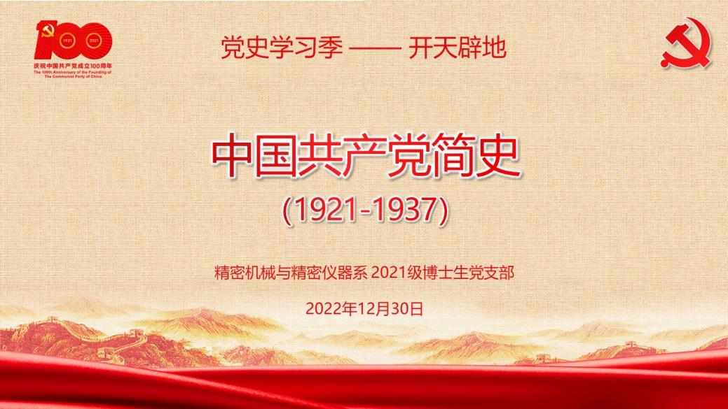 2022年12月30日下午,精密机械与精密仪器系2021级博士生党支部以党史学习季之“开天辟地”为主题开展了党史学习教育主题党日活动。党支部组织“党史学习季”系列活动,旨在系统化加强支部党员党史学习教育,做到汲古学新,知史爱党。首期活动线上开展,支部全体同志参加活动。