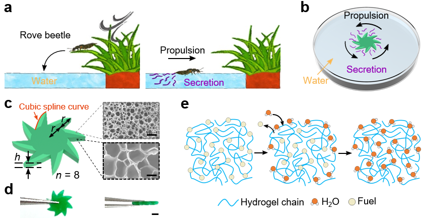 图1.微马达的自驱动原理。(a-b)受到突眼隐翅虫启发的自驱动水凝胶微马达;(c-d)微马达的微结构和形状设计;(e)微马达的自驱动原理。