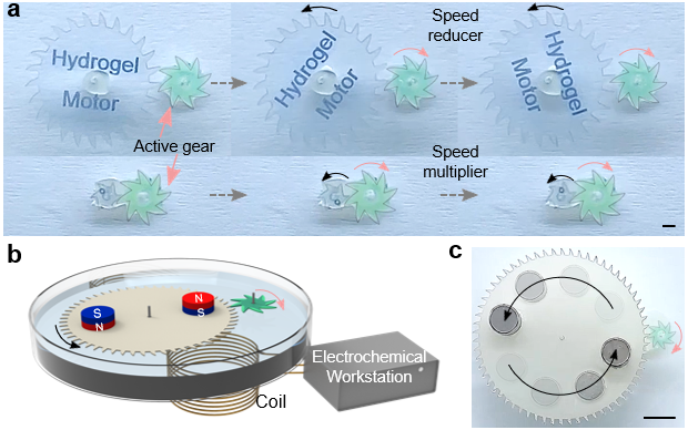 图2.微马达用于动能传输和发电。(a)自驱动微马达用于减速器和增速器;(b-c)自驱动微马达用于微型发电机。