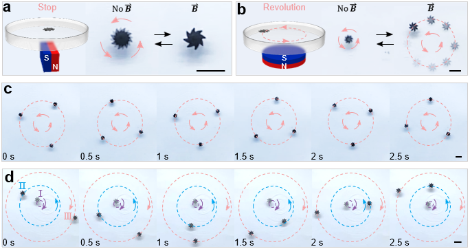 图3.自驱动磁性微马达的运动控制及用于水净化。(a)条形磁铁可以实现微马达的启停控制;(b)圆柱形磁铁可以实现微马达的自转/公转切换控制;(c-d)多个微马达的群体控制。