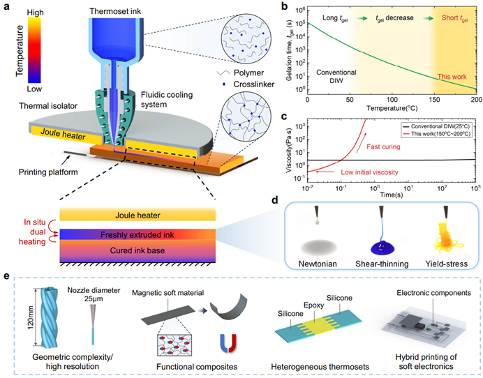 热固性材料在交联后形成三维空间网络结构,具有非常优异的力学性能和稳定性。近年来,热固性材料在软体机器人和柔性电子等领域扮演着愈发重要的角色。新型软体机器人对复杂结构与功能性提出了更高的需求,面向其开发一种简单、普适、廉价的热固性材料制造方法具有重要的意义。然而,热固性材料的3D打印仍然存在诸多限制,如固化原理,材料的流变性和成型效率等。近日,必威betway西汉姆网页版 工程科学学院机器人与智能装备所张世武教授研究团队李木军副教授,近代力学系王柳特任教授与南加州大学Yong Chen教授合作,提出了一种原位双重加热(in situ dual heating, ISDH)策略,成功实现了对具有多种流变性质和功能特性的热固性材料的墨水直写(Direct ink writing, DIW)打印。成果以3D printing of thermosets with diverse rheological and functional applicabilities为题发表在国际期刊《Nature Communications》。
