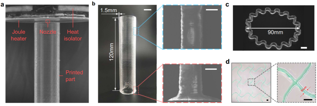 该论文提出通过邻接层快速加热和焦耳加热器加热的双重加热方式,使得代表性的热固性材料Sylgard 184最快可以在2s内固化,从而成功实现了未经改性的低粘度Sylgard 184的直接3D打印,打印结构与模具铸造结构的力学性能类似。通过采用不同直径的喷头(0.025~1mm),该方法的尺寸可扩展性得到了验证,实现了120mm的最大打印高度和50μm的分辨率。作者展示了一批具有不同性质的热固性材料的ISDH打印,这些材料具有跨越五个数量级的动态粘度变化,包括牛顿流体、剪切变稀流体和屈服应力流体等。
