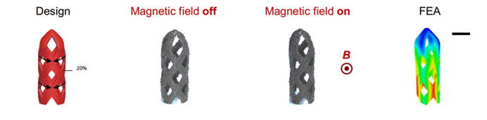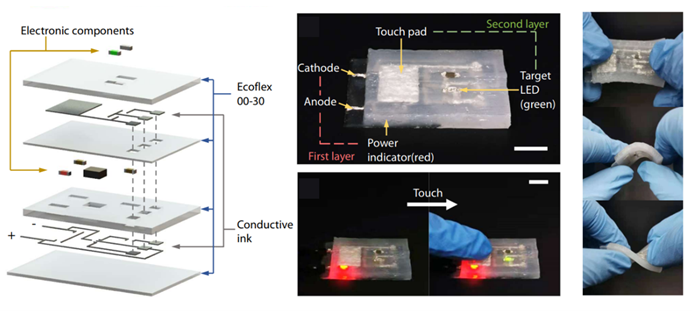 该工作还展示了ISDH打印丰富的功能性,包括打印多材料异质结构,以及不同NdFeB含量的磁响应柔性结构(如柔性血管支架)等。通过与“pick-and-place”工艺结合,ISDH打印还可以制造柔性电子设备。这些结果表明,ISDH打印在新兴的软体机器人、柔性电子等领域有着广阔的应用空间。