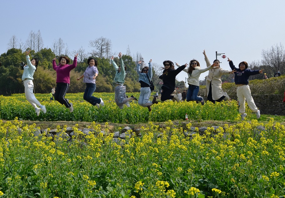 千载诗城池州杏花村因杜牧那首著名的《清明》诗而名扬天下,因景而蜚声四海,是融名人、名村、名诗、名酒于一体的历史文化古迹,古时曾有“十里烟村一色红,村酒村花两共幽”的记载。3月的杏花村,油菜、杏花、桃花等春花花开正艳,桃红柳绿,春光旖旎,空气里都充满了甜美的芬芳。南北朝诗人虞信的《杏花》写到“春色方盈野,枝枝绽翠英。依稀映村坞,烂漫开山城。”女教师们悠然徜徉在春色里,徜徉在杏花雨、杨柳风的意境中,欢声笑语、兴致高昂。