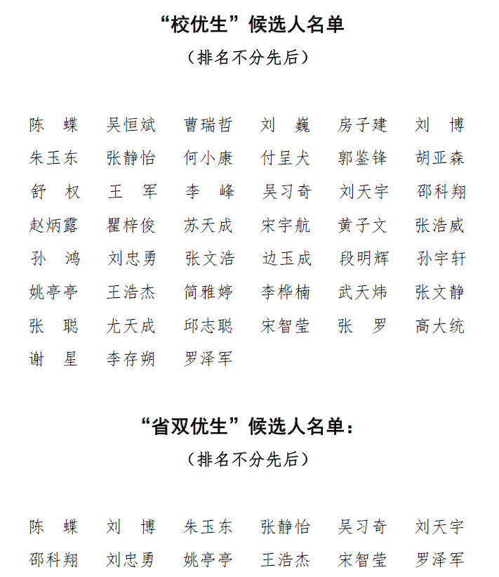 由班委会和团支部联合提名、班主任主持的班委会班干部初评,并广泛征求同学意见后,拟报陈蝶等45位同学为2023届“校优生”候选人,拟报刘博等12位同学为“省双优生”候选人。