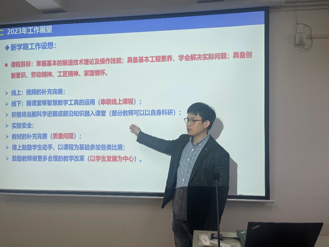 与会的老师助教纷纷发表了各自的看法,许旻老师觉得综合实践项目大部分的零件可以通过3d打印去实现,同时项目的内容可以以机械机构为主。郑航老师认为可以借助新购置的激光切割机去实现部分零件的加工,弥补线切割效率低下的问题。也有助教提出可不定具体项目主题,让学生自由发挥。针对即将开始的课程,袁小平老师还提出了实验安全的问题,并表示了已经建设完成的实验安全视频可供学生实践前使用。