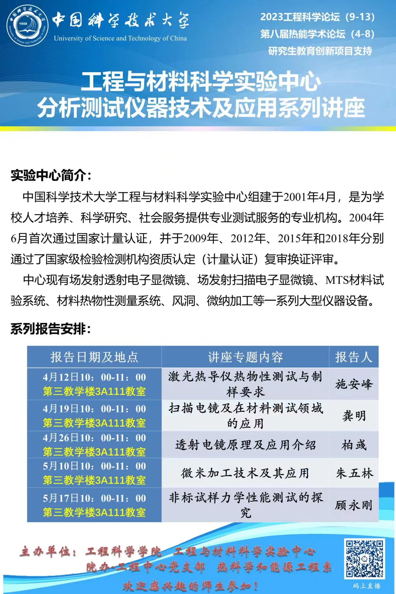 工程科学论坛(9-13)“工程与材料科学实验中心分析测试仪器技术及应用系列讲座”
