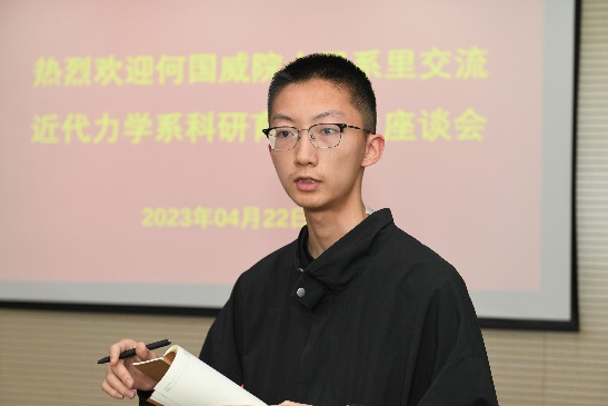 针对王润祺同学提出的对于力学这样的传统学科,哪些是重要的研究方向,或者说力学目前的风口在哪里的问题,何国威院士建议首先选择一个宽的研究领域,在其中找到自己的位置;另外,要选择力学的核心问题做出重大突破,例如流体的湍流和固体的本构;要抓住前沿交叉学科的机会开辟新的领域;要抢占学科热点的阵地取得重大成果。