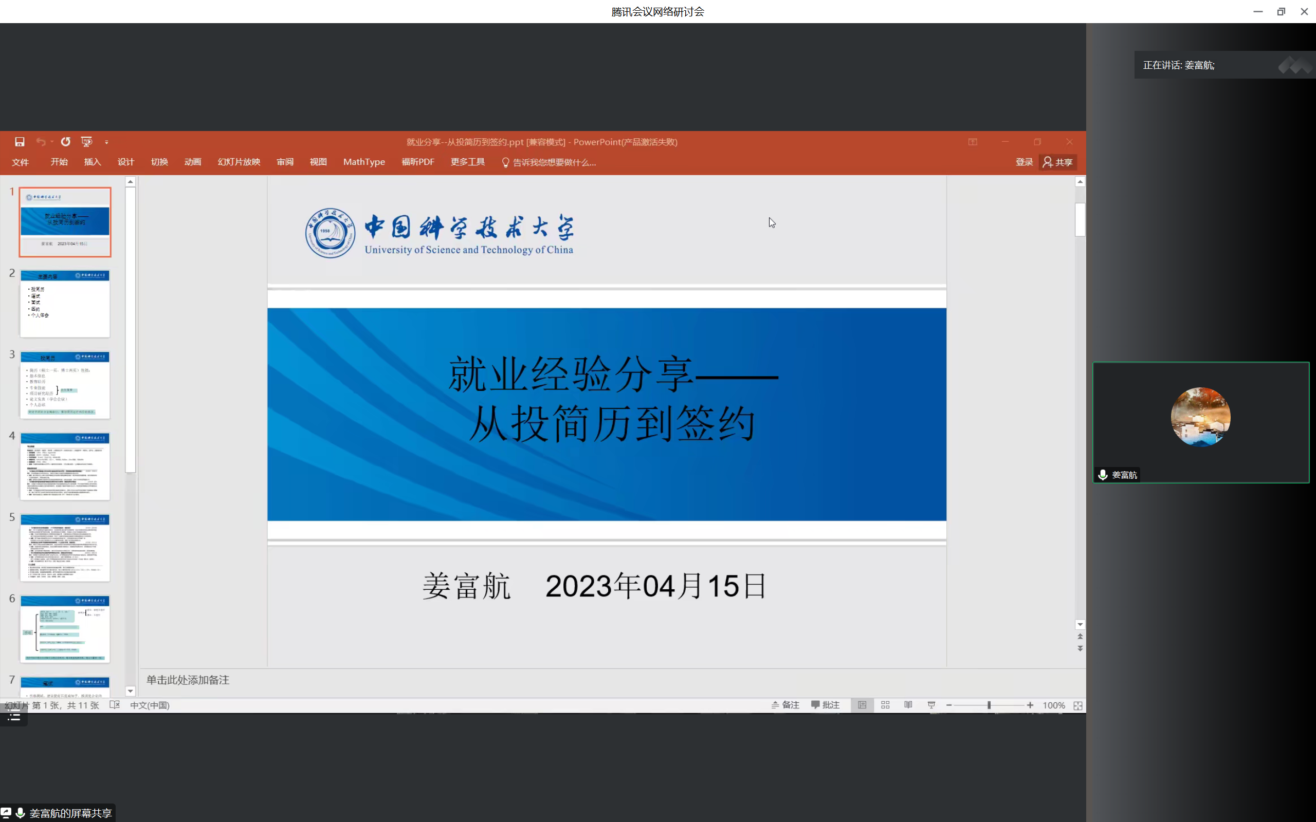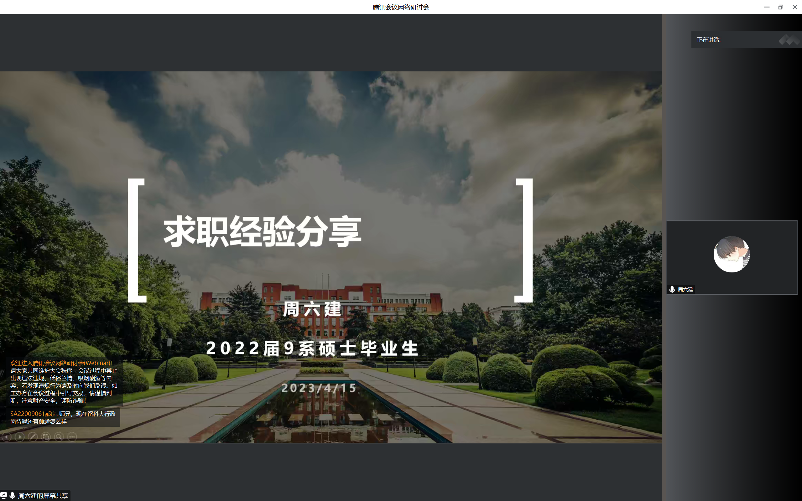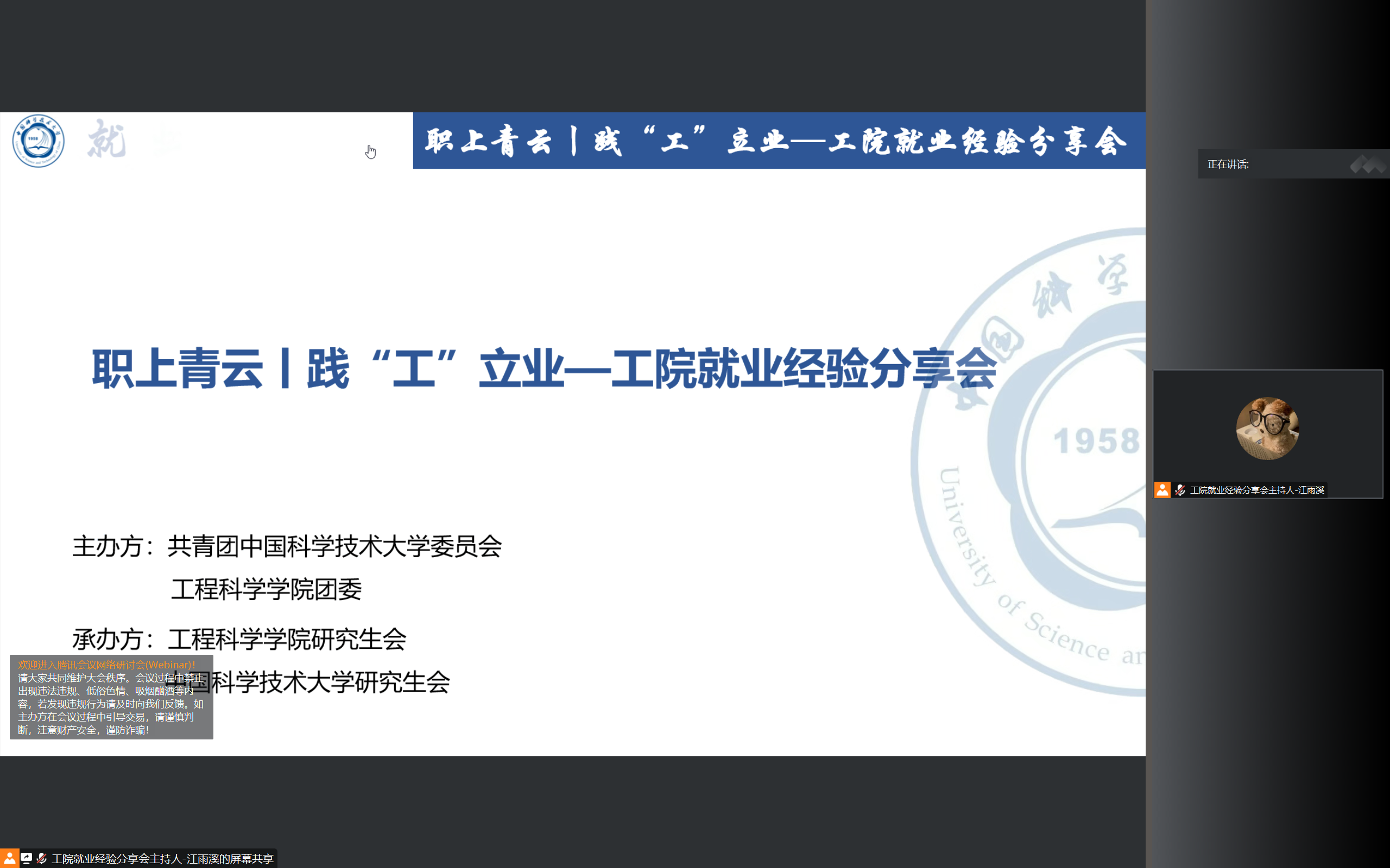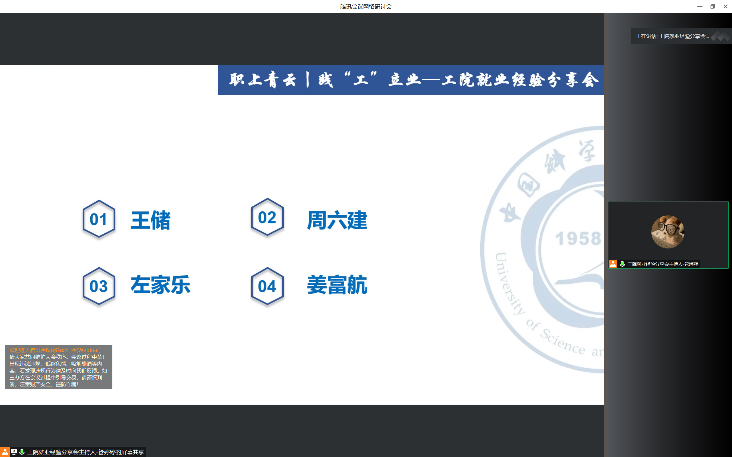 2023年4月15日晚19:00,工程科学学院就业经验分享会之企业篇通过腾讯会议线上召开。本场分享会邀请了19级热科学和能源工程系博士毕业生王储、19级精密机械与精密仪器系硕士毕业生周六建、19级精密机械与精密仪器系硕士毕业生左家乐、18级近代力学系博士毕业生姜富航四位嘉宾进行经验分享。