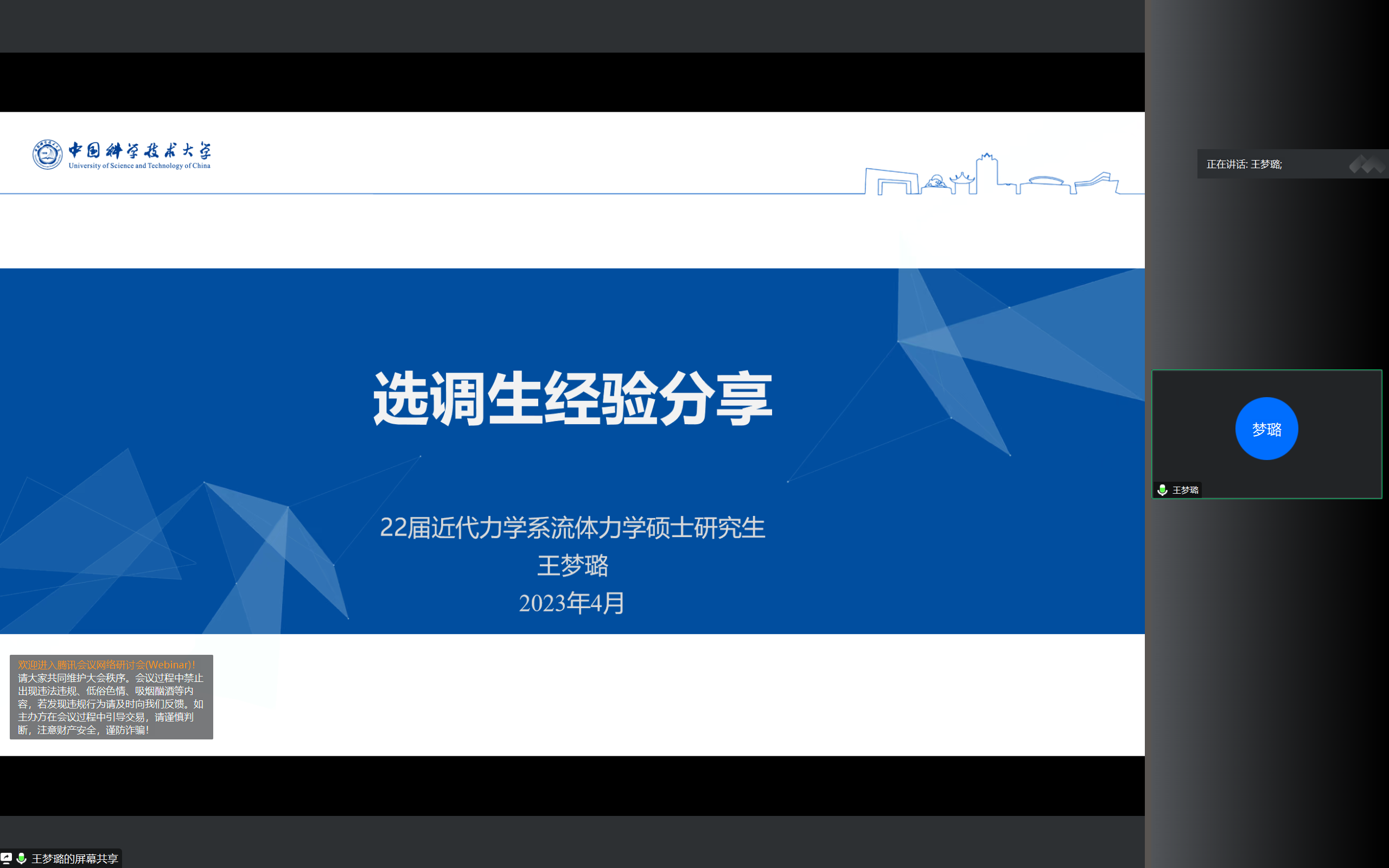 2023年4月16日晚19:00,工程科学学院就业经验分享会之选调篇通过腾讯会议线上召开。本场分享会邀请了19级近代力学系硕士毕业生王梦璐、18级精密机械与精密仪器系