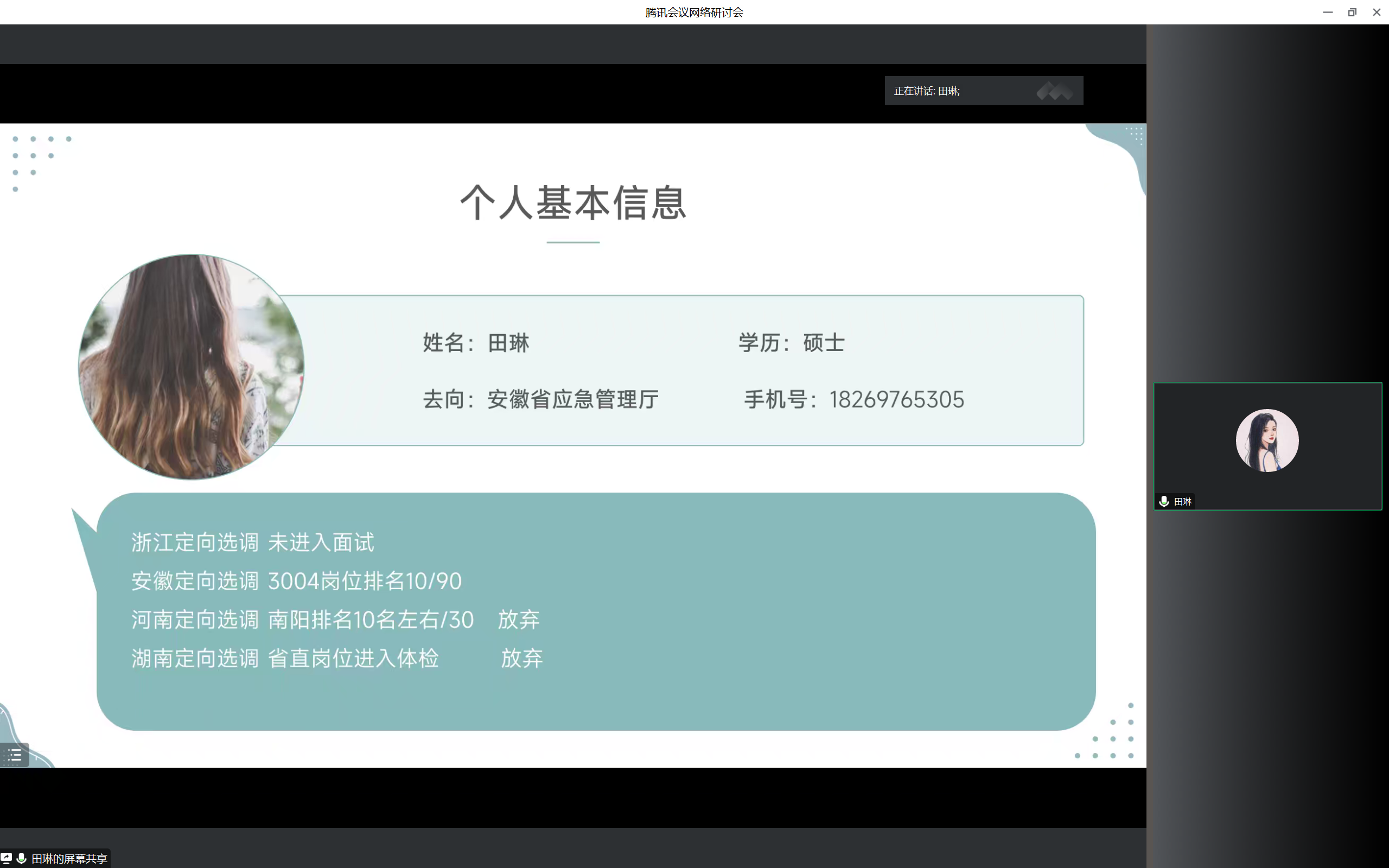 田琳师姐首先和大家分享了了自己基本信息,包括报考了那些省份的选调,哪些通过了哪些没有通过,接着提到理工科学生的备考具有时间紧张、竞争激烈、精力有限的特点,因此更需要省时高效地准备,告诉大家可以从“定向选调生之家”、“选调生”微信公众号,中国科大就业信息网—校园招聘—基层就业、各省组织部网站上进行信息搜集,最后以安徽定向选调为例和大家详细介绍了考试题型、考试技巧等。