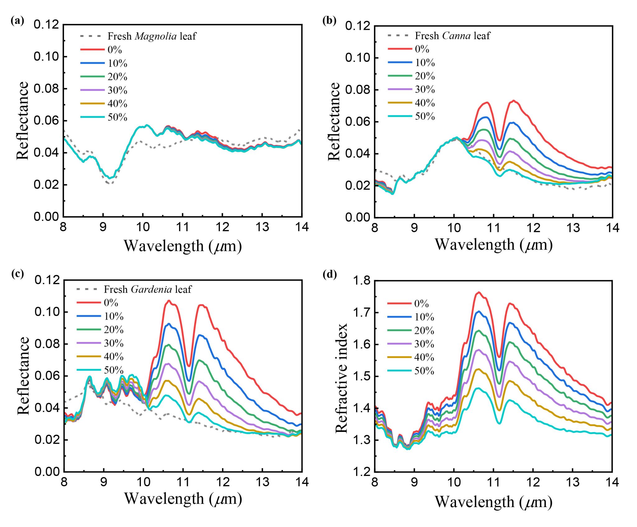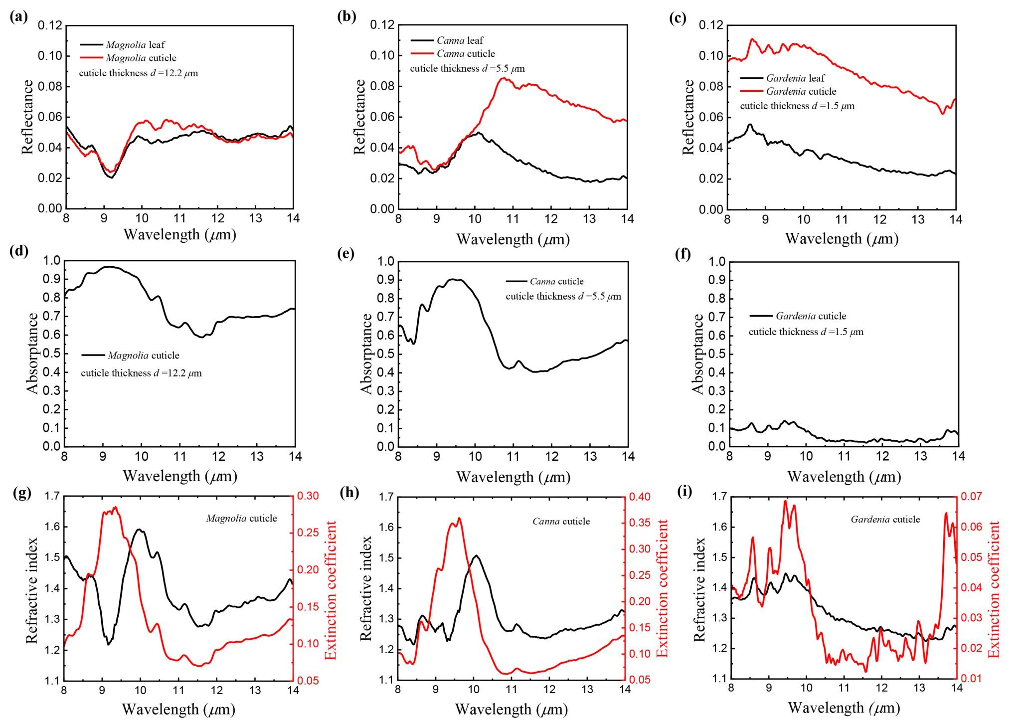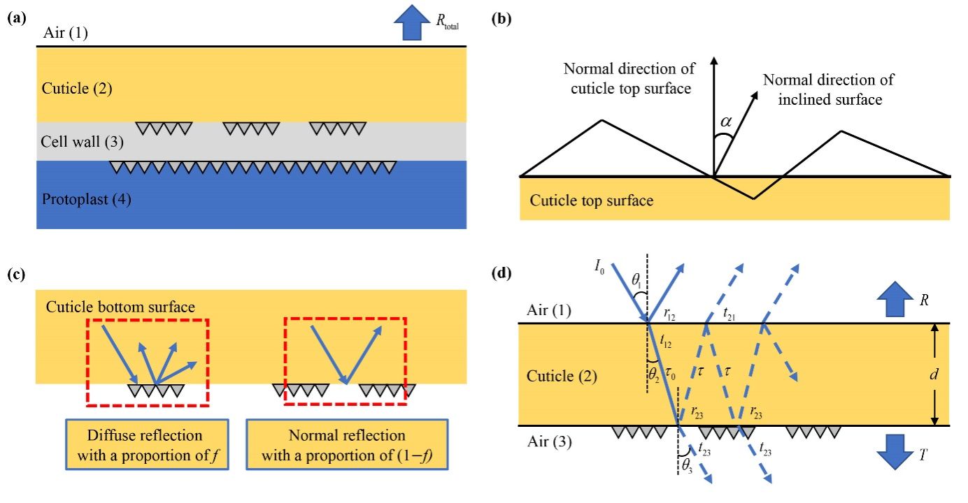 叶宏教授团队根据植物叶片的表皮结构(图1)构建了热红外辐射传输模型(Leaf-TIR model)(图2),探讨了叶片TIR光谱特征的形成机理。结果表明,随着角质层厚度减小,叶片与角质层反射率的相似性减弱(图3)。这是因为薄角质层在8-14μm范围内具有较弱的吸收特性,导致对叶片反射特征的影响较弱。当角质层足够薄时,叶片的TIR反射率随含水量的减少而提高,这是由于角质层与含水量较少的细胞壁的折射率之差增大所致(图4)。
