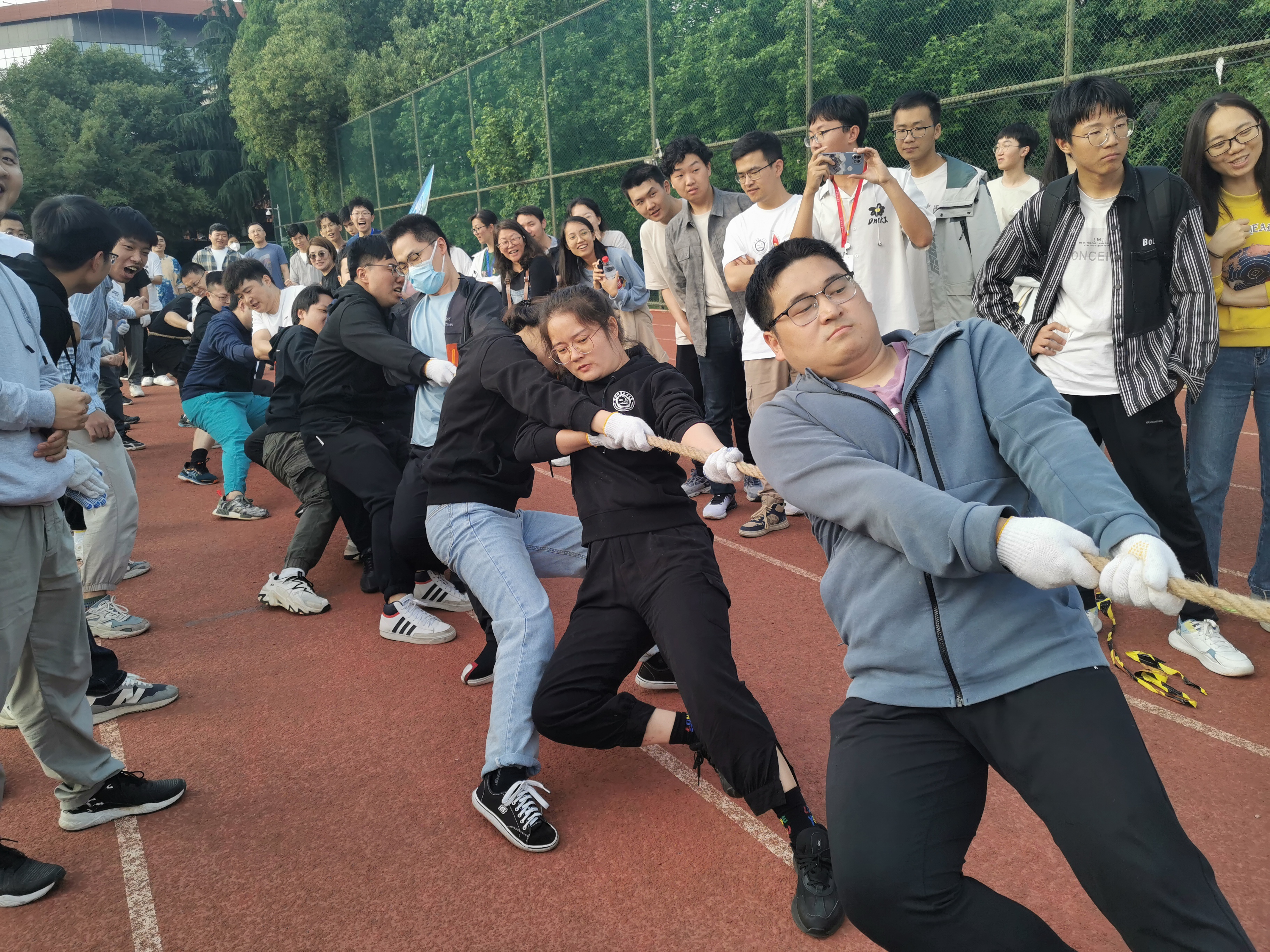 热身活动之后,随着刘明侯书记一声锣响,比赛正式开始。各参赛队员紧握长绳,个个斗志昂扬,拼尽全力,奋力争夺。操场上瞬间沸腾起来,加油声、喝彩声、欢呼声此起彼伏,响成一片。胜负难分的关键时刻,队员们毫不退却,咬紧牙关,用坚持和汗水诠释了团结拼搏的精神。