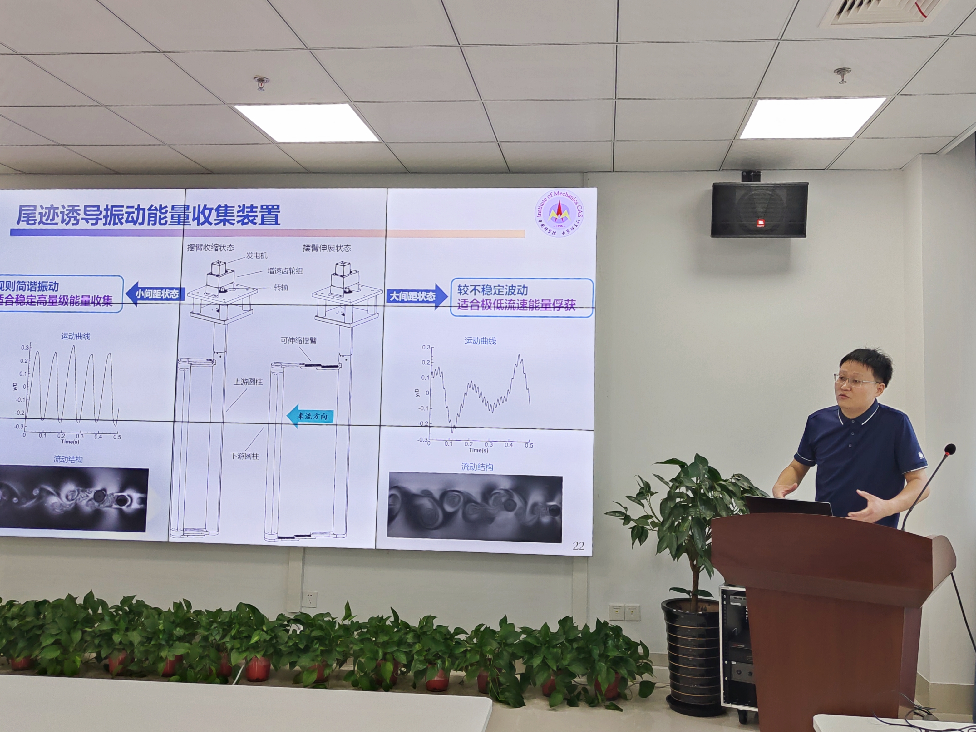 杨文超副研究员的报告题目为 “串行圆柱尾迹相互作用及尾迹诱导振动的能量收集”。流动中多个串行物体尾迹的相互作用广泛存在于土木工程、海洋工程和热能工作中的各种问题,特别在流固耦合的相关问题中有着重要研究价值。其中的一个应用是基于流致振动的能量收集,以实现低流速情况下的能量俘获。杨文超副研究员介绍了一个摆动式尾迹诱导振动能量收集系统,通过串行圆柱体系的尾迹相互作用诱导产生振动,实现流动动能的捕获与转换。通过实验揭示了振动模态与流动模态的相互对应关系,可以用于尾迹诱导振动中的尾迹相互作用分析,揭示出尾迹相互作用对下游圆柱振动特性的影响,为后续的尾迹诱导振动能量收集的应用发展提供重要的研究基础。