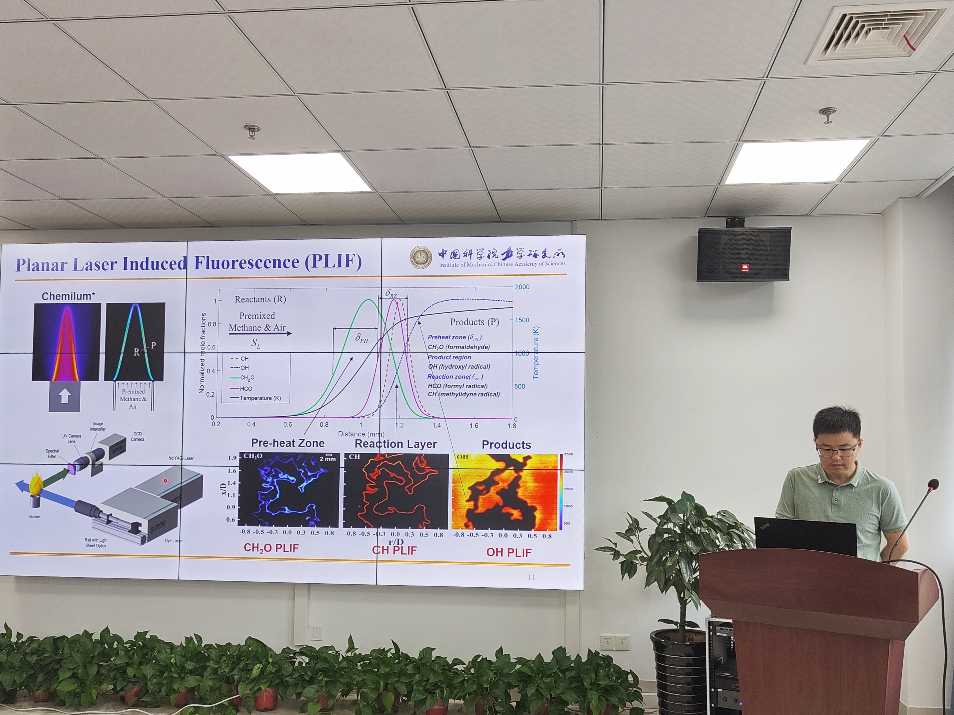 于德海副研究员的报告题目是“非稳态预混火焰点火理论研究”。先进推进系统运行过程中面临极限燃烧情况,比如内燃机贫燃与稀释燃烧,航空发动机高空点火,超燃冲压发动机高速点火。预混点火是开启燃烧状态的核心机制,相关研究具有重要的科学价值和工程指导意义。于德海副研究员面向燃烧基础理论问题,基于经典点火理论研究基础,探索非稳态效应对预混火焰点火过程的影响规律。针对静止预混可燃气,提出非稳态预混火焰点火理论模型,其合理表征在有限尺度与持续时间的外部点火源驱动作用下,点火核的形成与演化特征,并揭示了最小点火能量随点火源释热速率的变化规律。