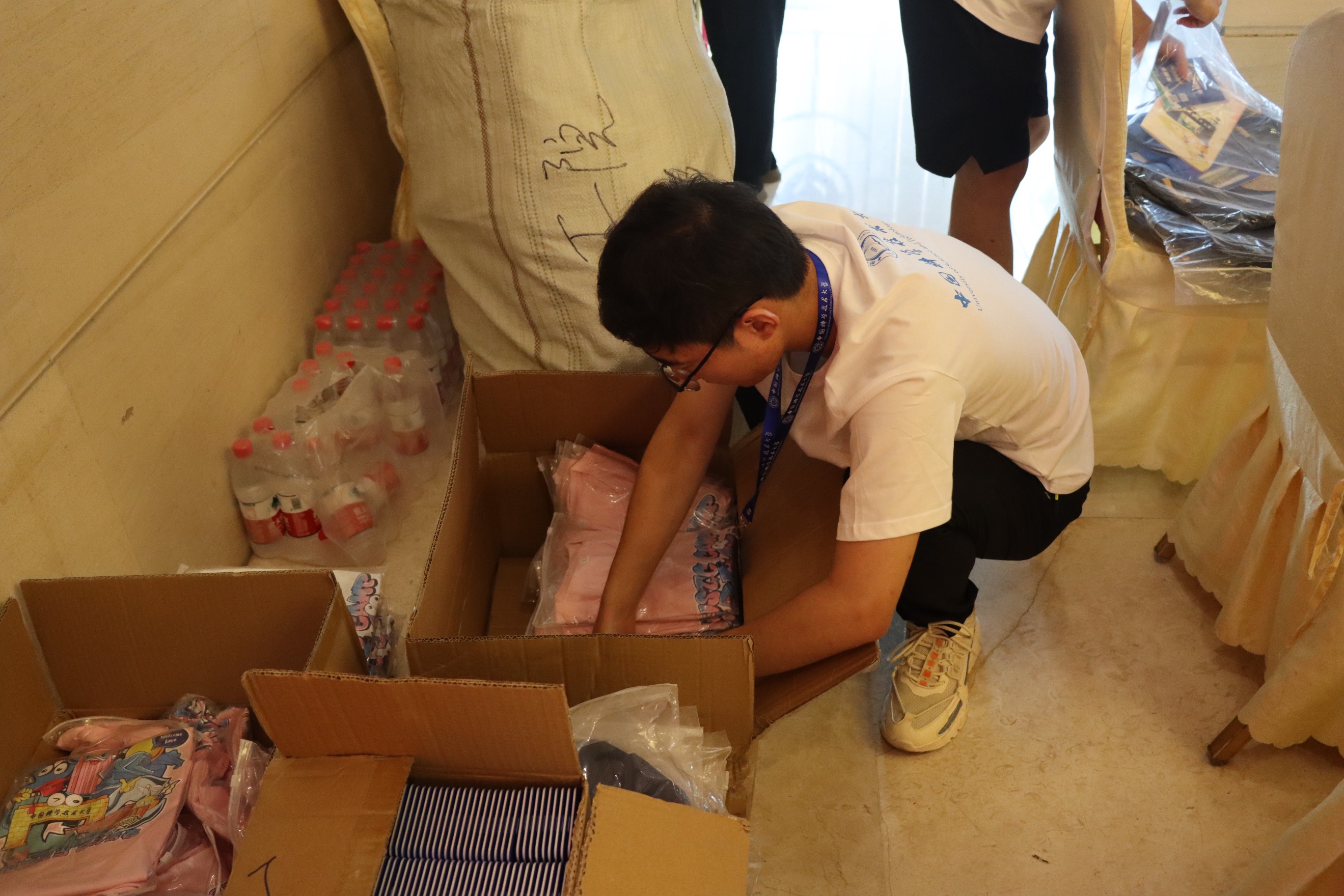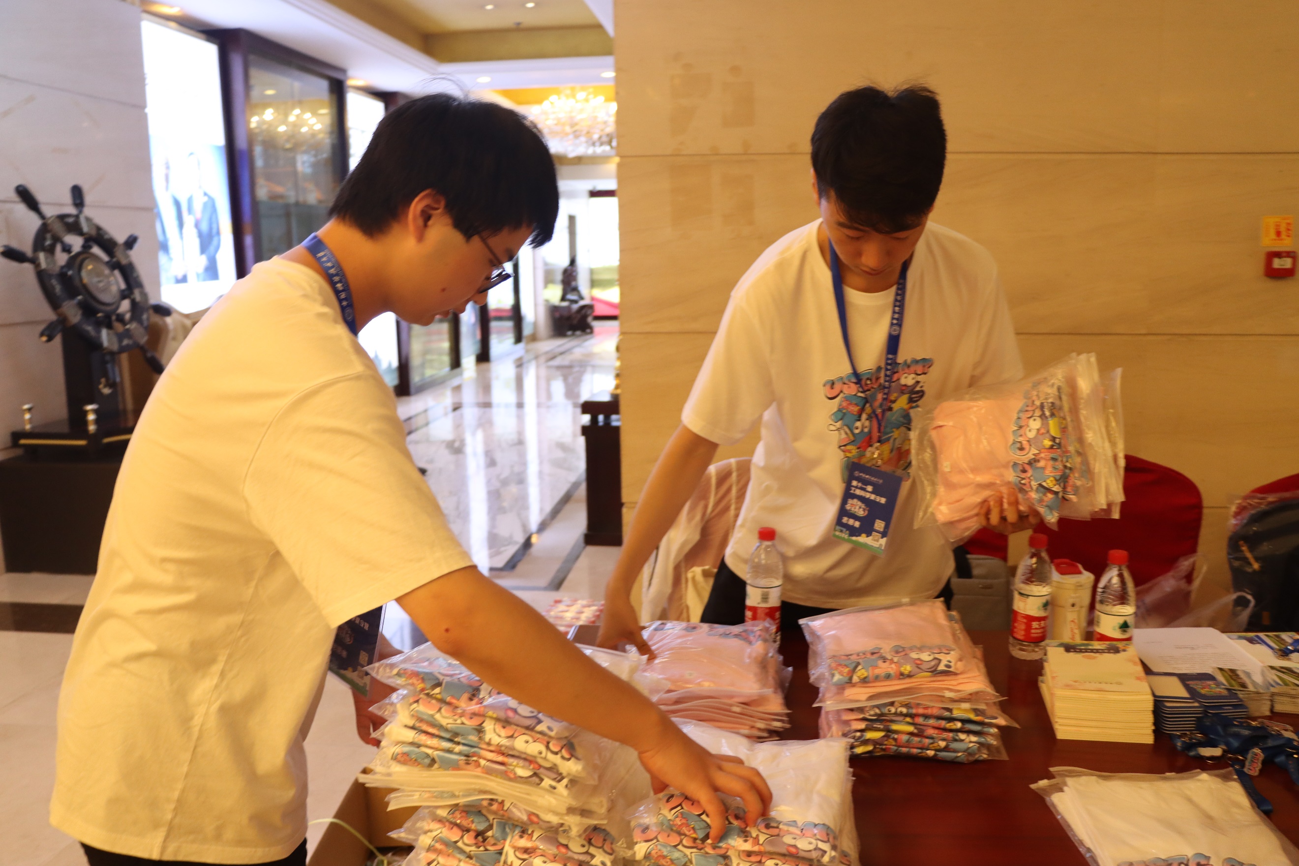 工程科学学院的志愿者们在现场负责人的带领下分工合作,为营员们准备入营物品。