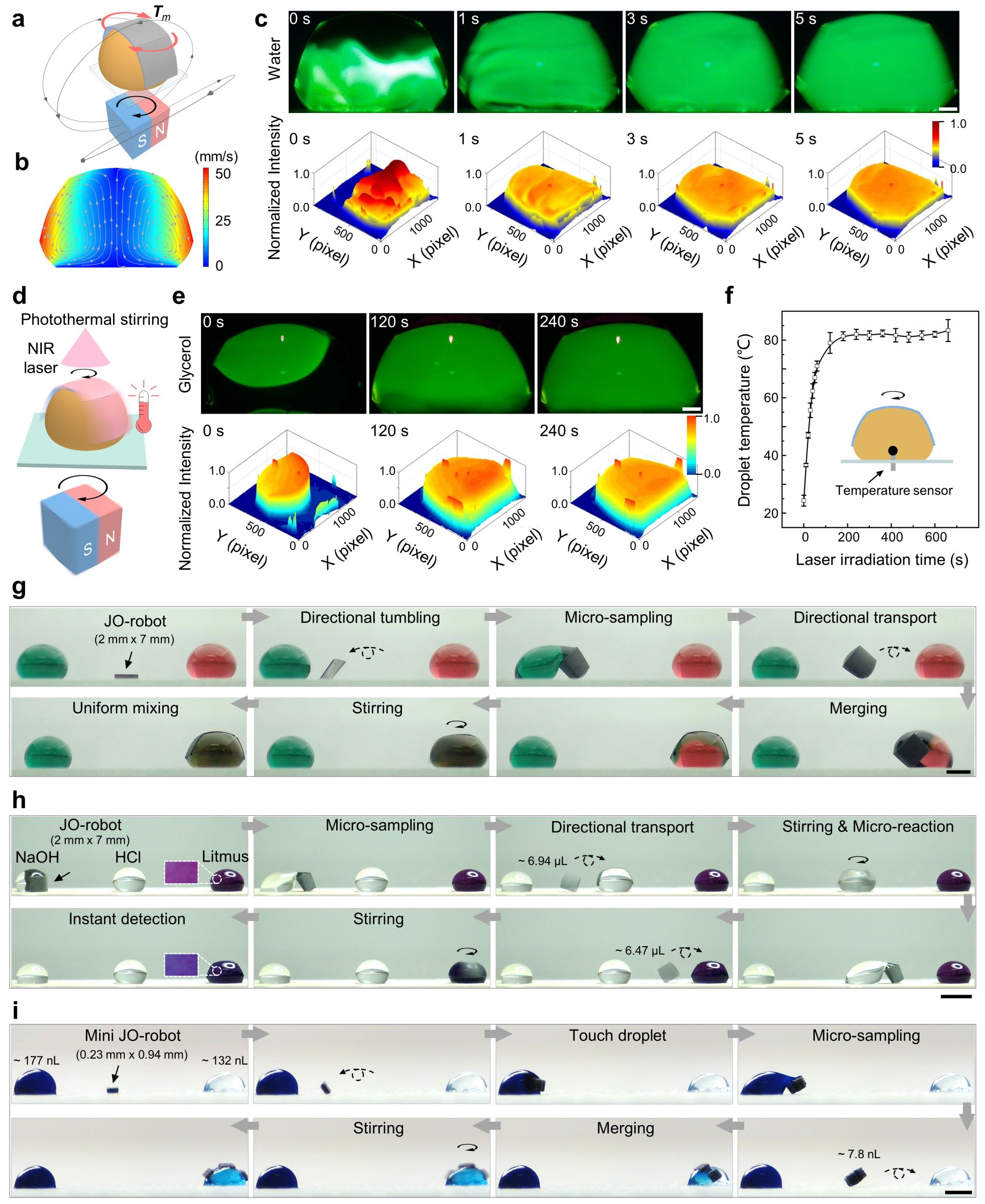 如前所述,磁响应双面神折纸机器人可以实现类似于商业化磁力搅拌机的搅拌及加热功能。图2的荧光分布图清晰展示了搅拌过程中液滴的混合程度。除了能够实现水的快速混合之外,通过机器人的加热搅拌功能还可以有效实现高粘度液体(甘油)的快速混合。加热温度可以达到80℃以上。