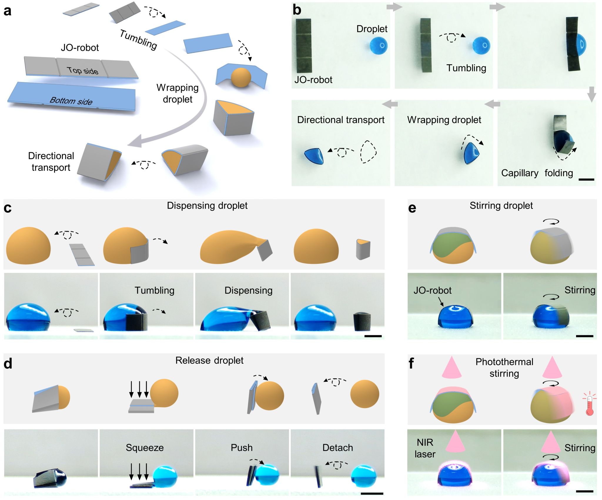 图2.基于磁响应双面神折纸机器人的液滴搅拌、光热搅拌以及多功能液滴操纵集成
