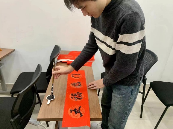 活动当晚,支部精心准备了毛笔墨水和各式春联。毛笔字不太熟练的同志们可以选择临摹款春联,磨练毛笔字书写技巧;而希望发挥自己想象力的同志们,则可以自己创作,表达自己对新的一年的祝愿。