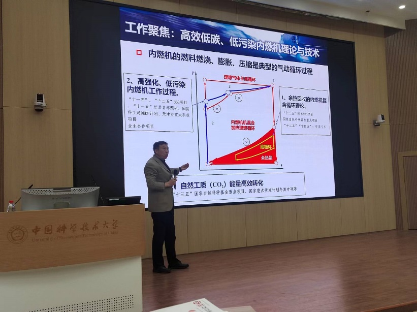 舒歌群通过分析世界各国所提出的碳中和的方案与政策,引出第二类技术——“可再生能源”,例如风能、太阳能、水能等进行电力脱碳与零碳化是实现碳中和的关键技术。聚焦与高效低碳、低污染内燃机理论与技术,结合内燃机的“卡诺循环”过程,舒歌群介绍了“余热回收理论”、“高强化低污染循环过程”、“自然工质能量高效转化”等国家重点项目研究,并结合冬奥场地专项计划为同学们生动展示了高新技术在“双碳领域”的应用。