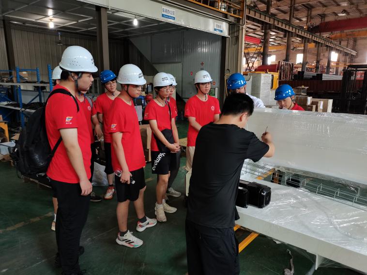 在创新激光,实践团成员们了解到前沿的激光焊接技术;在思纳克热流道有限公司,亲眼目睹了热流道这一小众科技赛道;在卧龙集团,观摩了车间内流水线上生产电机的过程。期间,浙江晶盛机电股份有限公司的发展让同学们深刻认识到高质量人才对高端制造业企业发展的巨大助力,看到了绍兴智新机电科技生产的质量优良的风机和特种流设备。在中嘉自动化,同学们了解到目前国内储能系统的现状与发展方向;在南特起重,成员们头戴安全帽,深入起重机制造车间,体悟传统工业的转型更新。
