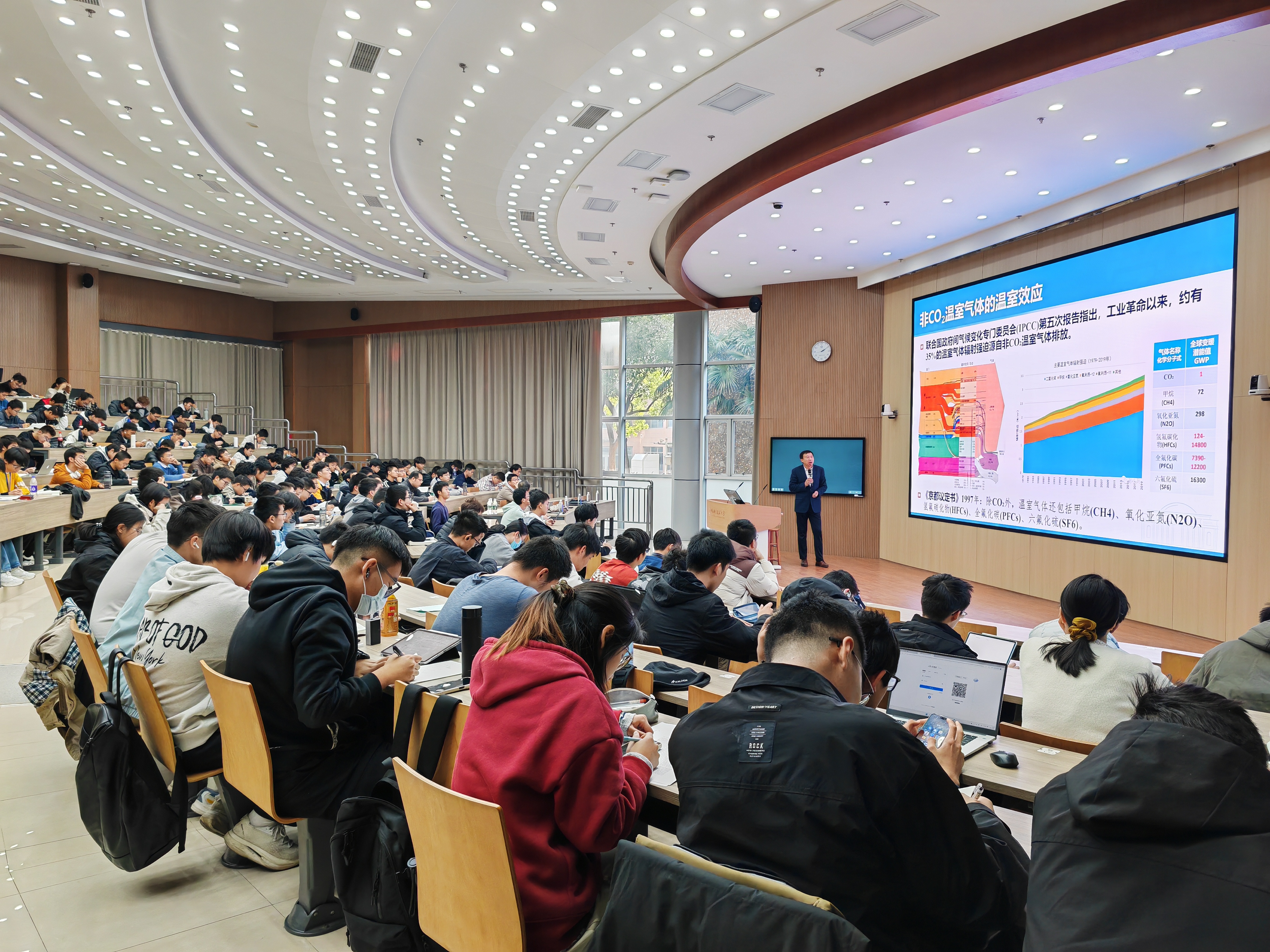 11月26日下午,“工程科学前沿”课程系列讲座之“双碳战略与CO₂热力循环技术”报告会在西区3B103多功能教室举办,中国科学院院士、校党委书记舒歌群教授为300余名2025级本科生授课。报告会由工程科学学院执行院长吴恒安主持。