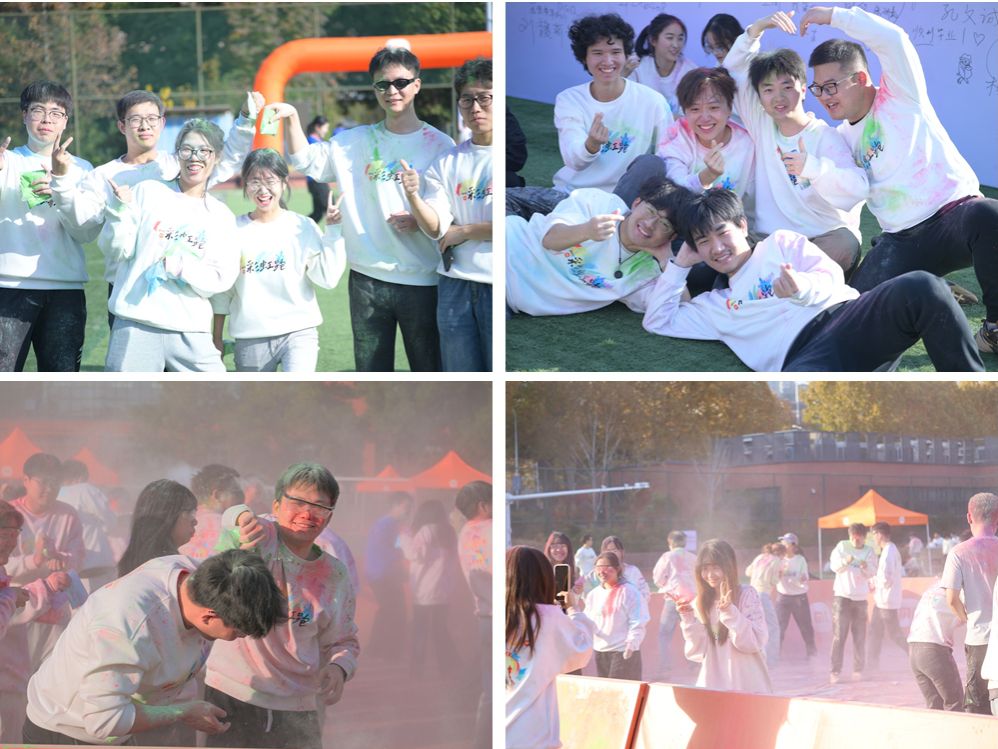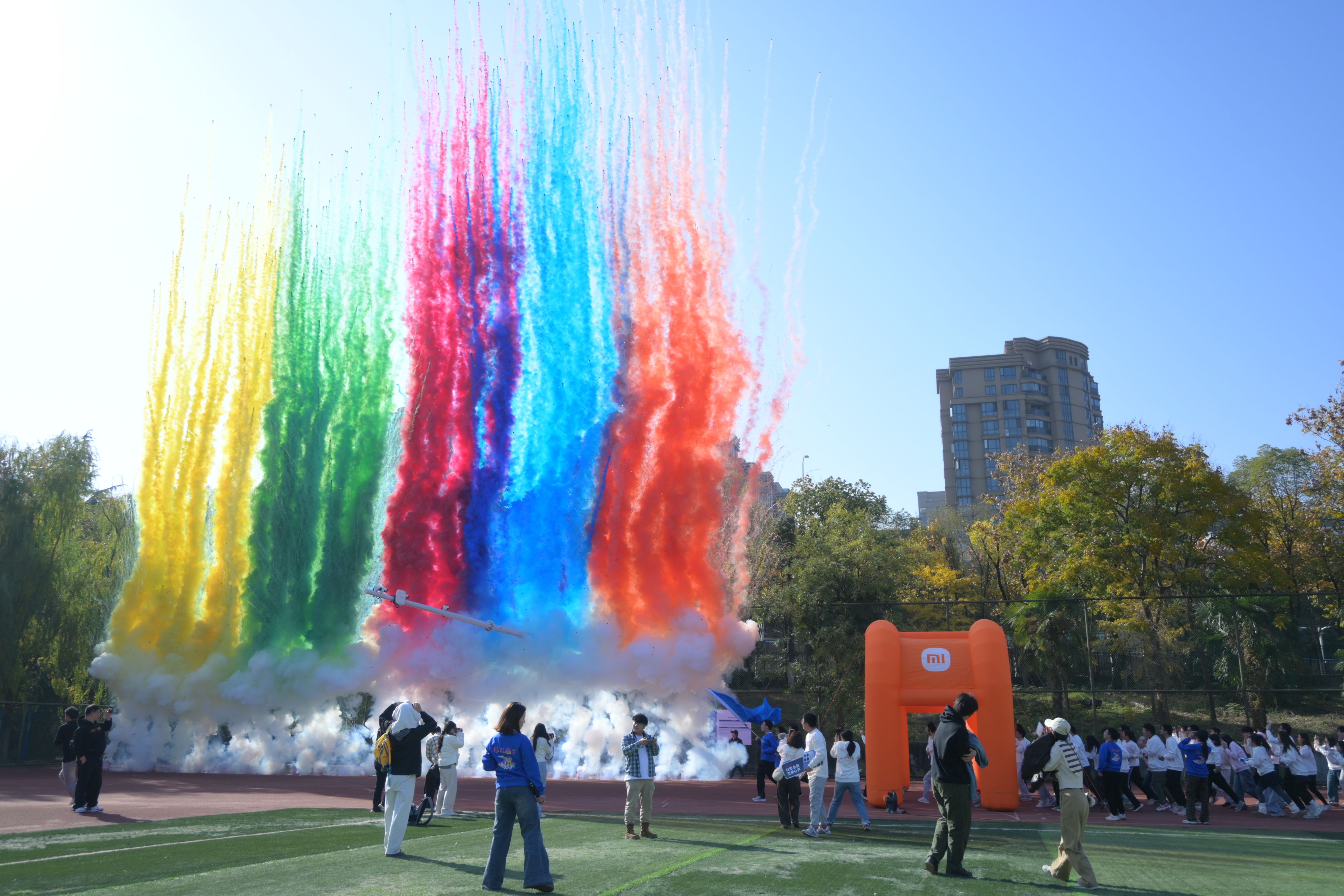 活动当天中午,上千名师生陆续抵达西区操场检录处,领取定制卫衣等专属物资,并在展板上签名留念,记录这一充满欢乐的时刻。随着第一轮舞台表演的精彩上演,现场气氛被迅速点燃。参与者们换上统一的白色活动卫衣,精神饱满地集结于起跑线前。起跑令下,起点处同时扬起绚丽的彩虹烟幕墙,环校彩虹跑正式拉开序幕。参与者们沿着既定路线奔跑,不仅在运动中感受活力与快乐,还在沿途设立的多个彩粉站点互动,收集不同颜色的彩粉。欢声笑语洒满校园道路,形成了初冬校园里一道独特的风景线。