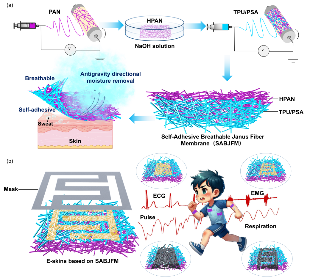 电子皮肤在健康监测、疾病诊断和人机交互等领域展现出巨大潜力。然而,传统的弹性薄膜基底缺乏透气性和导湿性,长期佩戴会导致汗液积聚,不仅引发皮肤炎症,还会导致信号失真。虽然现有的多孔透气膜改善了舒适度,但往往缺乏内在的自粘附性,需要额外的胶带固定,这又引入了新的透气性问题和界面不稳定性。如何在保证透气导湿的同时实现可靠的自粘附,一直是电子皮肤领域亟待解决的难题。针对上述挑战,研究团队利用静电纺丝技术成功研制出双层自粘附透气Janus纤维膜(SABJFM),该薄膜由亲水性的水解聚丙烯腈(HPAN)层和疏水粘附性的热塑性聚氨酯/压敏胶(TPU/PSA)层组成。该研究创新性地将压敏胶引入静电纺丝工艺,构建了兼具疏水性和自粘附性的微纤维层,这不仅赋予了薄膜直接粘附皮肤的能力,还通过微纳孔隙结构和润湿性梯度,实现了汗液的“反重力”定向传输。实验表明,SABJFM能够迅速将皮肤表面的汗液泵送到外部亲水层并快速蒸发,即使在剧烈运动出汗的情况下也能保持皮肤干爽,同时防止汗液回流。与传统的医用胶带和商用薄膜(如PDMS、TPU等)相比,SABJFM展现了优异的透气性(WVTR约为167.75 g m⁻² h⁻¹)和湿润环境下的稳定粘附力。